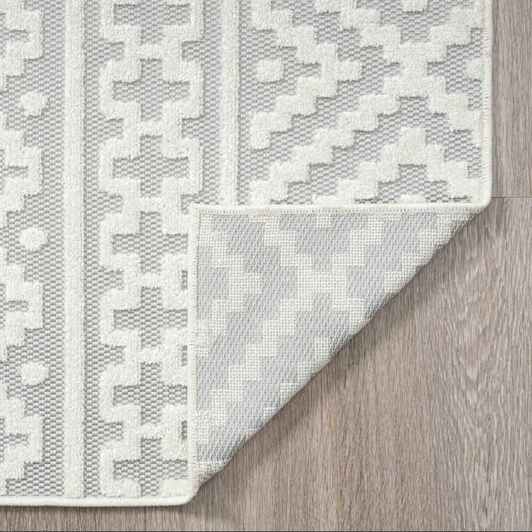 Experience the opulent Tayse Breeze Gray rug for an elevated touch in any average space. The folk tribal design serves as the ideal base for your personal oasis. Made with durable flatwoven polypropylene material, this rug can withstand high traffic and daily use. It's perfect for outdoor spaces like patios, mudrooms, basements, decks, and porches, providing a resilient and stunning solution. Easily clean with mild detergent and water from your garden hose, and ensure thorough drying before use. Rotate periodically to prevent wear and fading from intense sunlight.