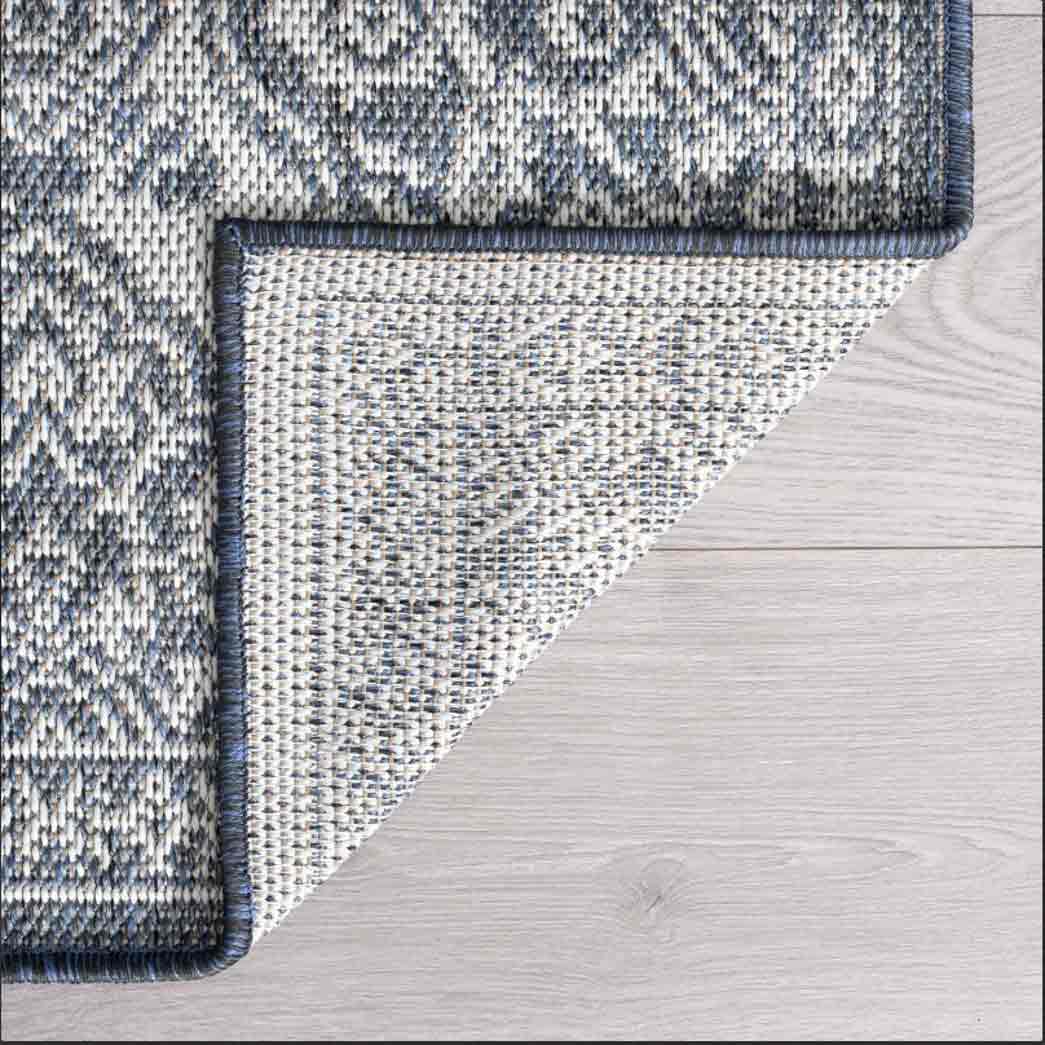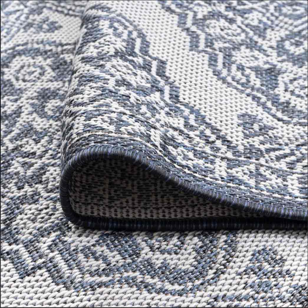 Experience a daring style adventure with Tayse's Vista Blue rug! The floral ogee pattern and border add a charming touch to this transitional indoor outdoor rug that is designed for endurance. Transform any high traffic area into a tranquil retreat with this strong, expertly crafted flatwoven rug in trendy colors. Simply use mild detergent and water from a garden hose for easy clean up, then let it dry completely. Ideal for a mudroom, patio, deck, or family room.