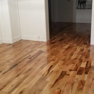 It has a warm rustic cabin ambiance in oak consisting of small, large and pocket knots with veins running through it. Matching wood filler should be used to fill these knots (recommended filler Bona Pacific Filler). Expect the flooring boards to be random length ranging from less than 1 foot to 3 feet. Consider that there will be flaws in the flooring boards and that extra labor may be necessary. Flaws on your flooring may be amended simply by filling pocket knots with wood filler and squaring off insignificant cracks on the butt joint, short splits or broken tongue and grooves. Some boards may have an "x" marked on them. When boards are run through the mill, they are marked with an "x" to indicate that boards are a grade #3, common grade, or value grade. These boards do not qualify for Select down to #2 and that is why they are sold at lower prices. The “x” will be sanded off when finishing the floor. Please check out how beautiful this flooring can be when it’s finished in the pictures above.