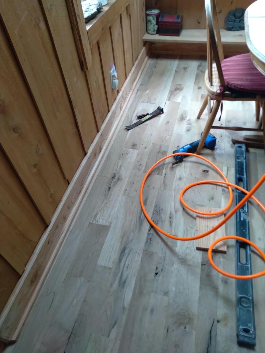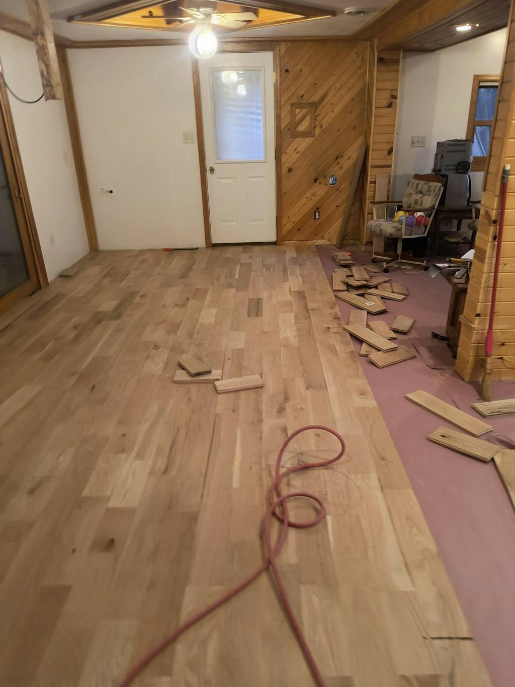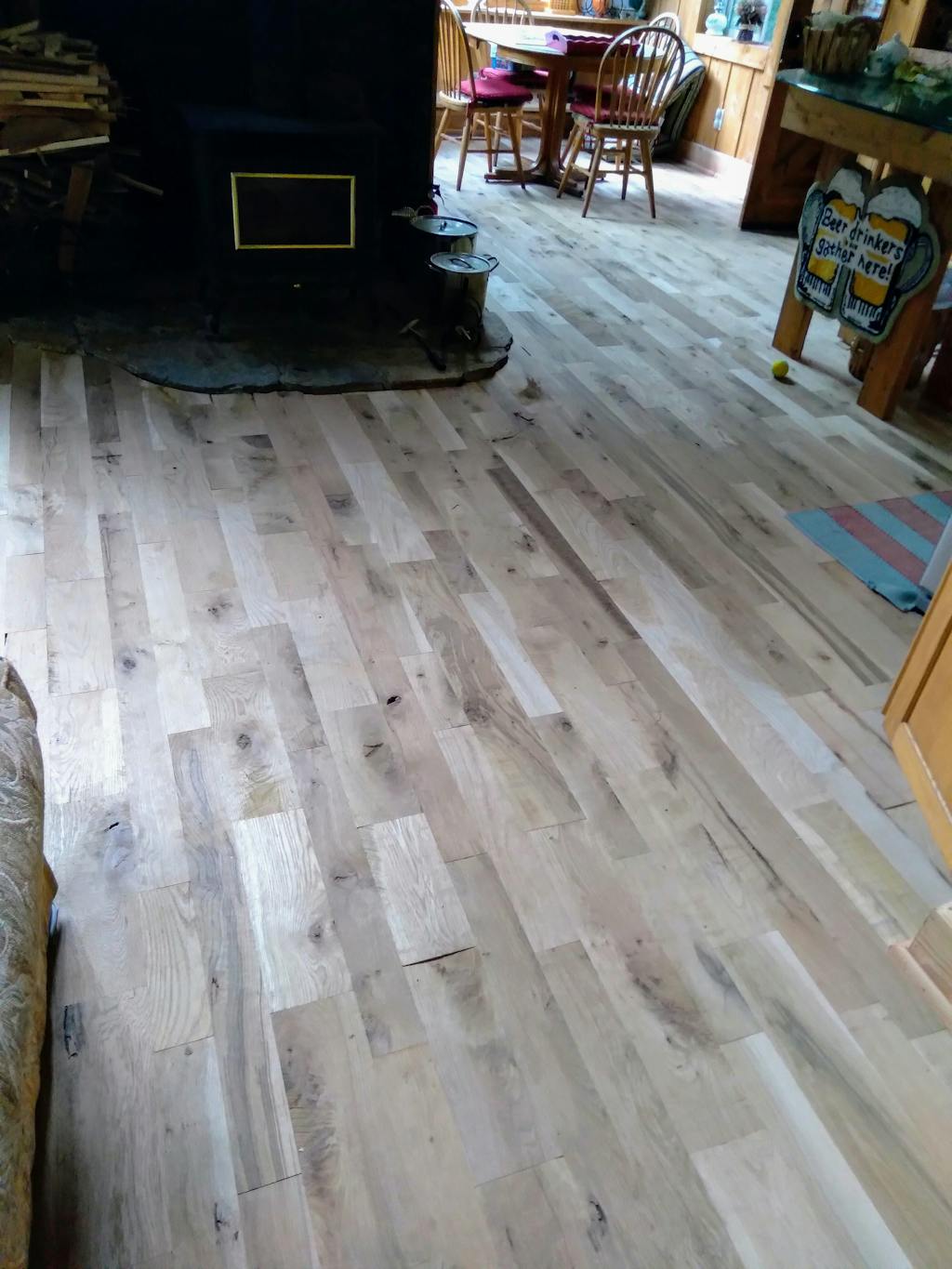 It has a warm rustic cabin ambiance in oak consisting of small, large and pocket knots with veins running through it. Matching wood filler should be used to fill these knots (recommended filler Bona Pacific Filler). Expect the flooring boards to be random length ranging from less than 1 foot to 3 feet. Consider that there will be flaws in the flooring boards and that extra labor may be necessary. Flaws on your flooring may be amended simply by filling pocket knots with wood filler and squaring off insignificant cracks on the butt joint, short splits or broken tongue and grooves. Some boards may have an "x" marked on them. When boards are run through the mill, they are marked with an "x" to indicate that boards are a grade #3, common grade, or value grade. These boards do not qualify for Select down to #2 and that is why they are sold at lower prices. The “x” will be sanded off when finishing the floor. Please check out how beautiful this flooring can be when it’s finished in the pictures above.